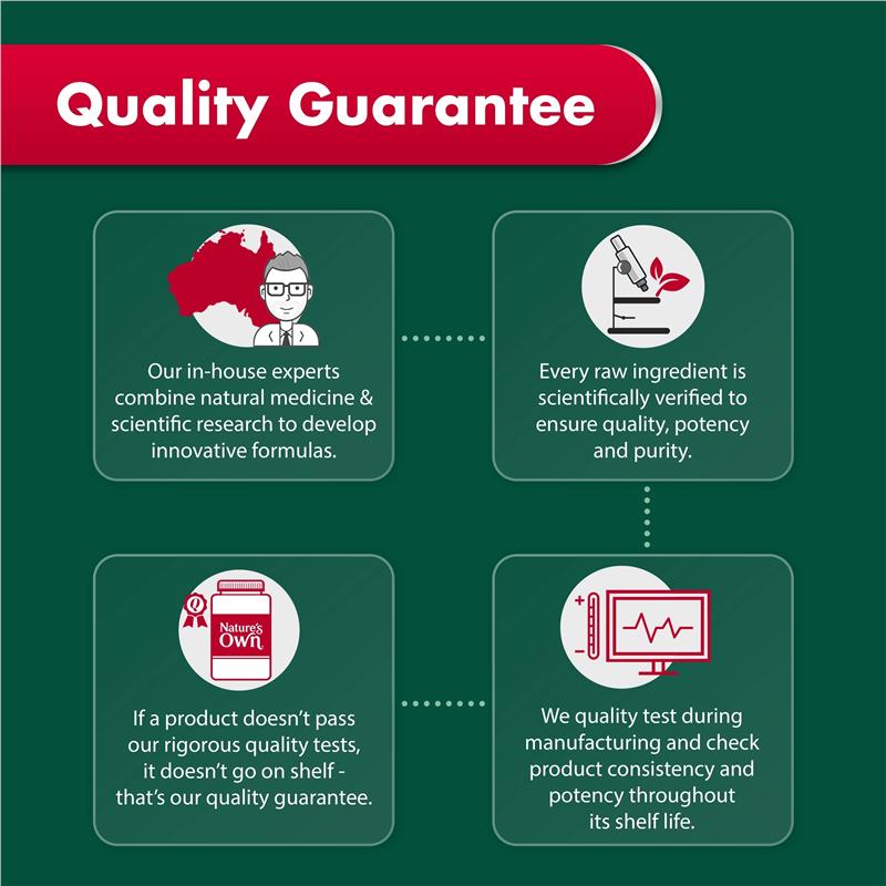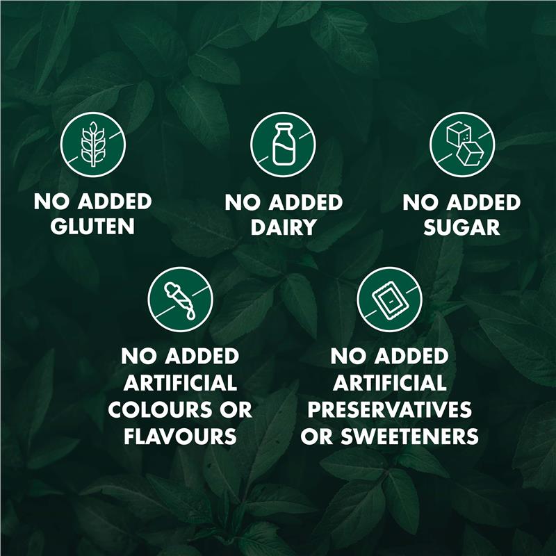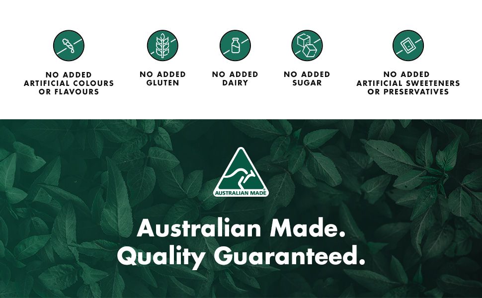 Không chứa: Gluten, Lactose, Đường, Màu hoặc Hương vị nhân tạo, Chất tạo ngọt nhân tạo, Chất bảo quản nhân tạo hoặc Các sản phẩm từ sữa.