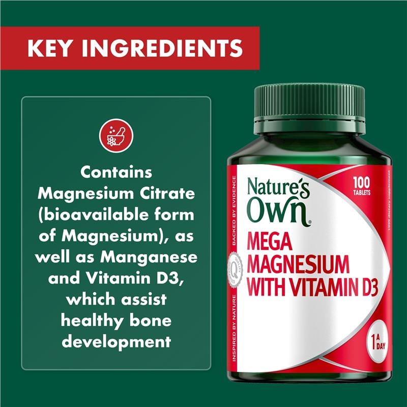 • Nature's Own Mega Magnesium với Vitamin D3 không chứa thêm gluten, lactose hoặc các sản phẩm từ sữa, hoặc màu nhân tạo, hương vị nhân tạo, chất tạo ngọt nhân tạo và chất bảo quản nhân tạo
