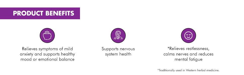 Tuyên bố về sản phẩm: Làm giảm các triệu chứng lo âu nhẹ, hỗ trợ tâm trạng khỏe mạnh hoặc cân bằng cảm xúc và hỗ trợ hệ thần kinh khỏe mạnh. Theo truyền thống được sử dụng trong y học thảo dược phương Tây để làm giảm sự bồn chồn, làm dịu thần kinh và giảm mệt mỏi về tinh thần.