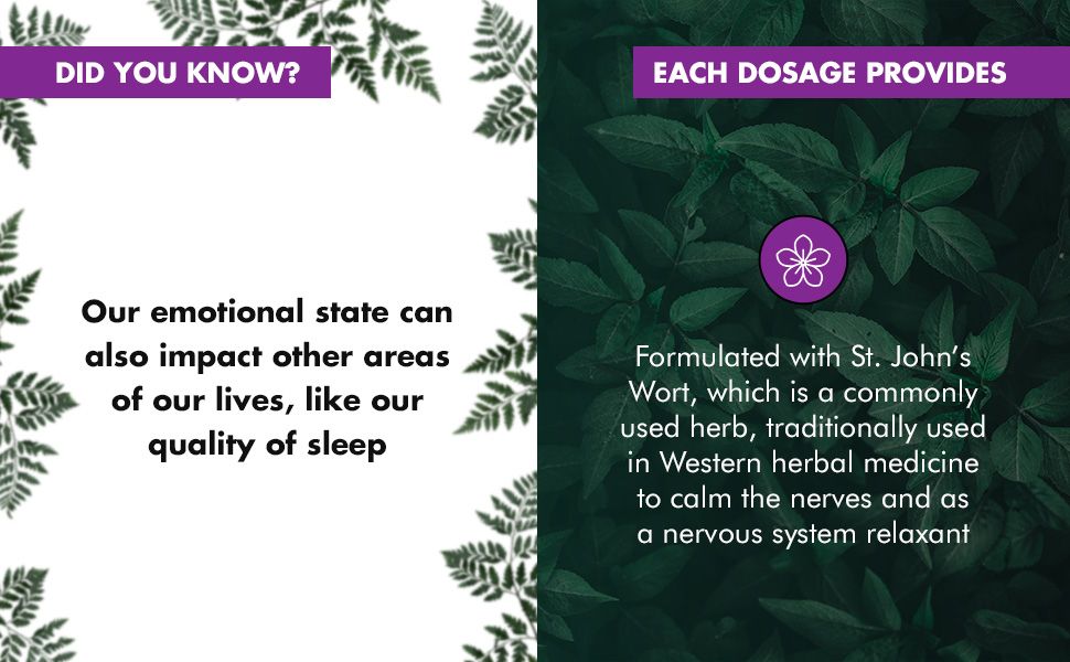 • LÀM DỊU THẦN KINH: Theo truyền thống được sử dụng trong y học thảo dược phương Tây để làm dịu và làm dịu thần kinh, và làm giảm các triệu chứng lo âu nhẹ• HỖ TRỢ CÂN BẰNG CẢM XÚC: St John's Wort đã được sử dụng trong y học thảo dược phương Tây để hỗ trợ cân bằng tâm trạng lành mạnh và cân bằng cảm xúc