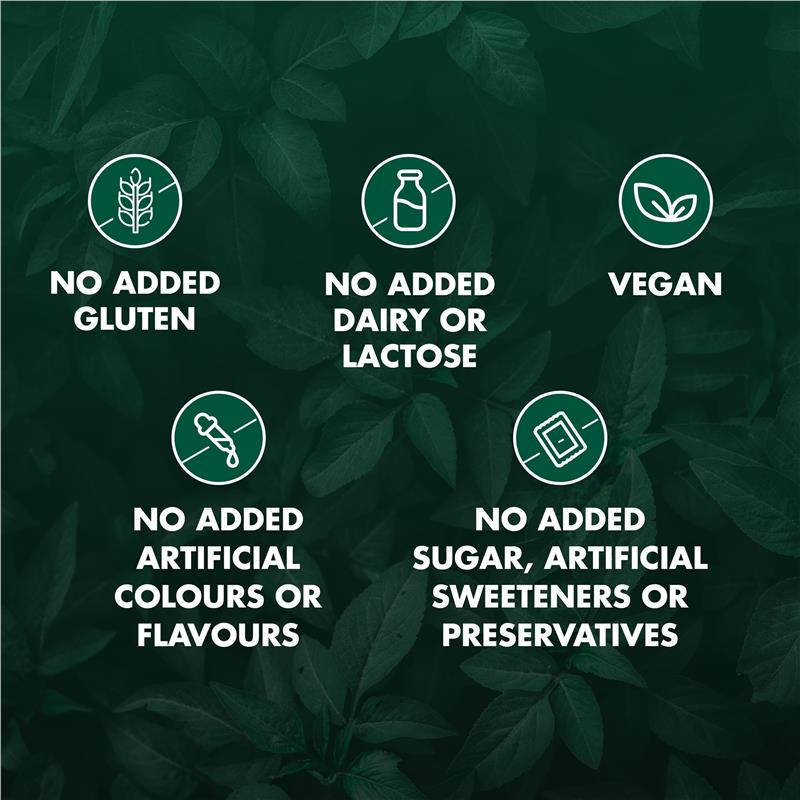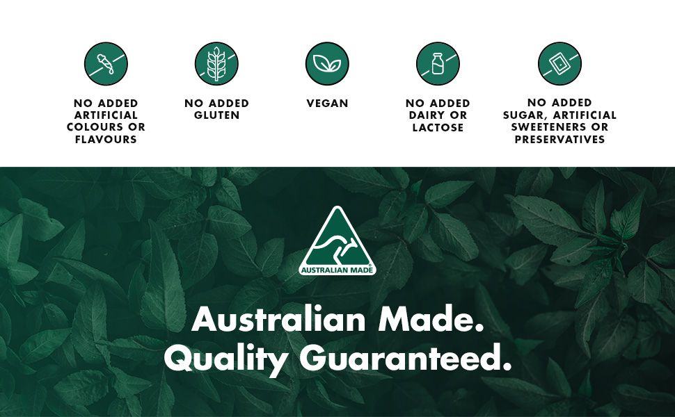 Không chứa: Gluten, Lactose, Đường, Màu hoặc Hương vị nhân tạo, Chất tạo ngọt nhân tạo, Chất bảo quản nhân tạo, Sản phẩm từ sữa hoặc Sản phẩm từ động vật. Thuần chay.