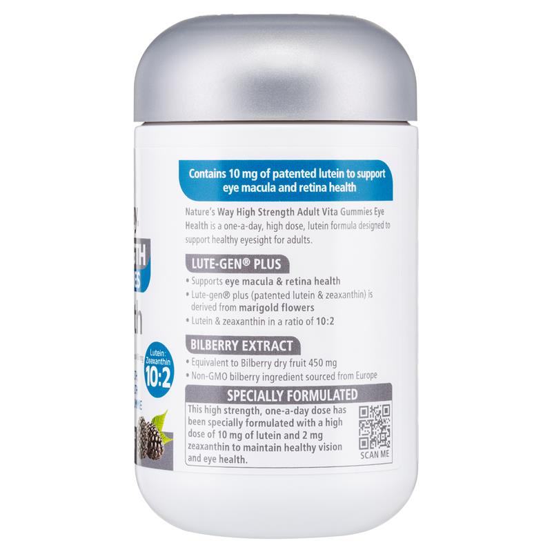 Nature's Way High Strength Adult Vita Gummies Eye Health hỗ trợ sức khỏe điểm vàng và võng mạc, thị lực và sức khỏe mắt. Liều cao trong một viên kẹo dẻo dùng một lần mỗi ngày.