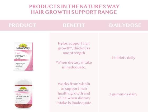 Thêm vào đó, không bổ sung đủ vitamin và khoáng chất để hỗ trợ tóc mọc trong chế độ ăn uống của bạn có nghĩa là mái tóc dài và khỏe mạnh dường như sẽ không bao giờ xảy ra. Viên uống Nature's Way Hair Growth Support + Biotin & Silicon chứa các chất dinh dưỡng chính giúp hỗ trợ tóc mọc, dày và chắc khỏe.