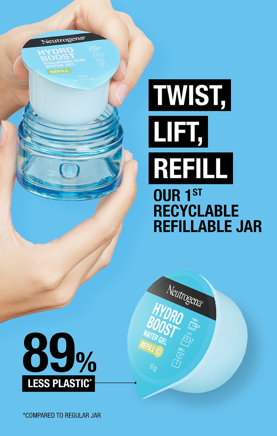 Thân thiện với hành tinh: Bao bì bên ngoài có thể tái chế 100%. Tái sử dụng lọ nhờ các hộp thay thế Hydro Boost® MỚI của chúng tôi.