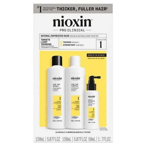 "Bộ sản phẩm Nioxin Pro Clinical's System Kit 1 là chế độ chăm sóc 3 bước dễ dàng được thiết kế dành cho tóc tự nhiên, chưa qua xử lý, mỏng nhẹ. Đã được thử nghiệm lâm sàng và da liễu, hệ thống làm dày tóc và da đầu hoàn chỉnh này giúp tóc bạn dày và chắc khỏe hơn, chống gãy rụng từ gốc đến ngọn. 8/10 người dùng thấy tóc dày hơn, bồng bềnh hơn trong 30 ngày!