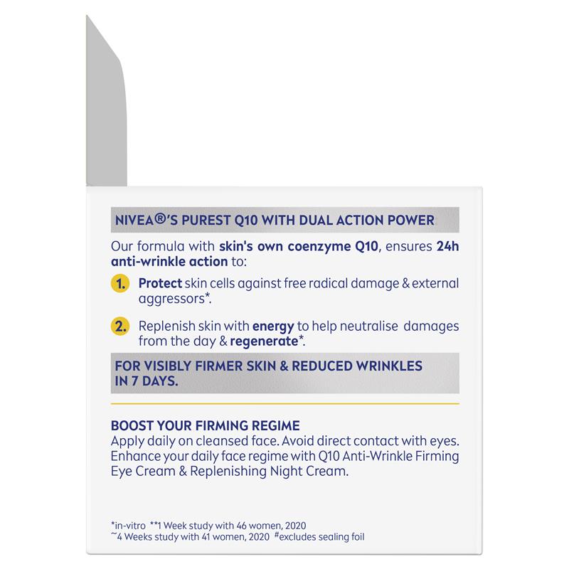Kem dưỡng da ban ngày chống nhăn NIVEA Q10 SPF30 chứa coenzyme Q10 mạnh mẽ, giống hệt 100% với loại mà da bạn tự nhiên sản sinh. Công thức Q10 được cấp bằng sáng chế này hoạt động hài hòa với làn da của bạn để làm săn chắc và giảm nếp nhăn rõ rệt trong 7 ngày.