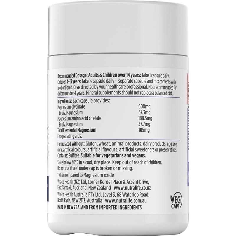 Mỗi viên nang thực vật cung cấp: Magie glycinate 600mg Tương đương với Magie 67,3mg Magie chelate axit amin 188,5mg Tương đương với Magie 37,7mg Tổng lượng Magie nguyên tố 105mg Chất hỗ trợ đóng gói.