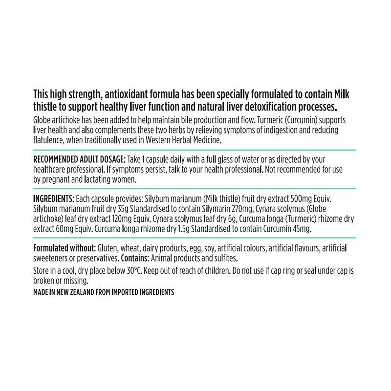 Công thức chống oxy hóa mạnh mẽ này được đặc chế để chứa cây kế sữa hỗ trợ chức năng gan khỏe mạnh và quá trình giải độc gan tự nhiên. Atisô toàn cầu được bổ sung để giúp duy trì sản xuất và lưu thông mật. Nghệ (Curcumin) hỗ trợ sức khỏe gan và cũng bổ sung cho hai loại thảo mộc này bằng cách làm giảm các triệu chứng khó tiêu và giảm đầy hơi, khi được sử dụng theo truyền thống trong Y học thảo dược phương Tây.