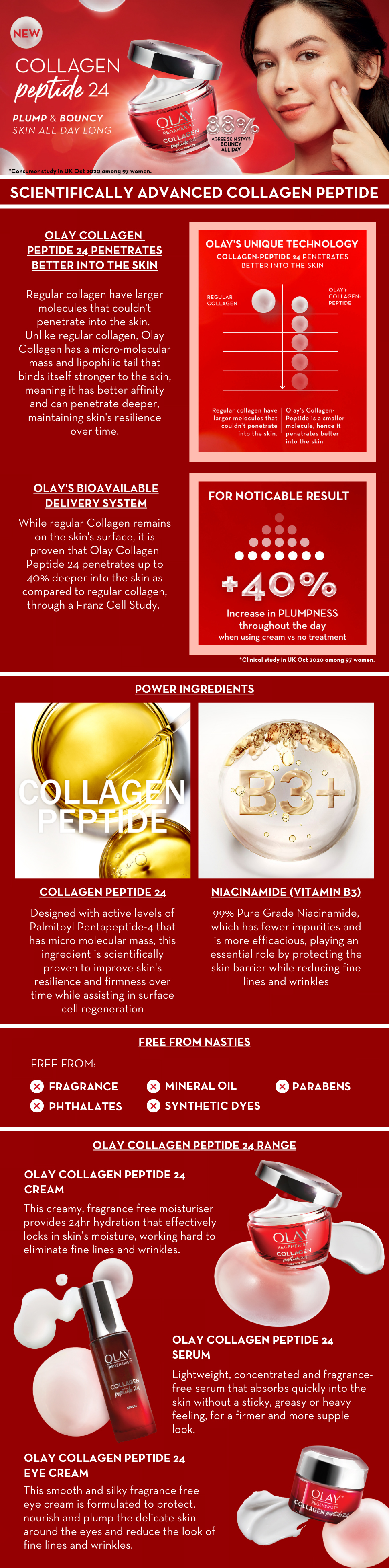 • Làm đầy đặn tức thì, săn chắc rõ rệt và làm mịn nếp nhăn với Collagen Peptide + Niacinamide thẩm thấu sâu^ vào da• Dưỡng ẩm cho da trong 24 giờ