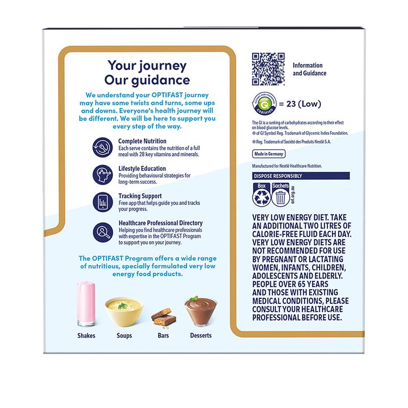 Chương trình OPTIFAST ® VLCD ™ cung cấp nhiều loại thực phẩm thay thế bữa ăn tiện lợi. Sữa lắc, món tráng miệng, súp và thanh.