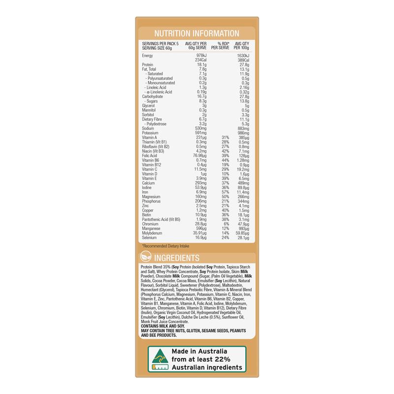 Hỗn hợp protein 35% (Protein đậu nành (Protein đậu nành cô lập, tinh bột sắn và muối), Protein whey cô đặc, Protein đậu nành cô lập, Sữa bột gầy), Hợp chất sữa sô cô la (Đường, (Dầu cọ thực vật), Chất rắn sữa, Bột ca cao, Khối ca cao, Chất nhũ hóa (Lecithin đậu nành), Hương vị tự nhiên), Sorbitol lỏng, Chất tạo ngọt (Polydextrose), Maltodextrin, Chất giữ ẩm (Glycerol), Chất xơ Prebiotic từ sắn, Hỗn hợp vitamin và khoáng chất (Phốt pho Canxi, Magiê, Kali, Vitamin C, Niacin, Sắt, Vitamin E, Kẽm, Axit pantothenic, Vitamin B6, Vitamin B2, Đồng, Vitamin B1, Mangan, Vitamin A, Axit folic, Iốt, Molypden, Selen, Crom, Biotin, Vitamin D, Vitamin B12), Chất xơ ăn kiêng (Inulin), Dầu dừa nguyên chất hữu cơ, Dầu thực vật hydro hóa, Chất nhũ hóa (Lecithin đậu nành), Dulche De Leche (0,5%), Dầu hướng dương, Nước ép quả la hán cô đặc.