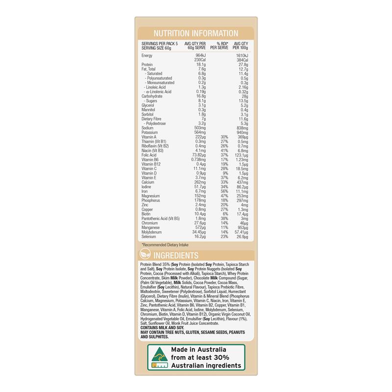 Hỗn hợp protein 35% (Protein đậu nành (Protein đậu nành cô lập, tinh bột sắn và muối), Protein đậu nành cô lập, Protein đậu nành dạng viên (Protein đậu nành cô lập, Ca cao (Xử lý bằng kiềm), Tinh bột sắn), Protein whey cô đặc, Bột sữa gầy), Hợp chất sữa sô cô la (Đường, (Dầu cọ thực vật), Chất rắn sữa, Bột ca cao, Khối ca cao, Chất nhũ hóa (Lecithin đậu nành), Hương vị tự nhiên), Chất xơ Prebiotic từ sắn, Maltodextrin, Chất tạo ngọt (Polydextrose), Sorbitol dạng lỏng, Chất làm ẩm (Glycerol), Chất xơ ăn kiêng (Inulin), Hỗn hợp vitamin và khoáng chất (Phốt pho, Canxi, Magiê, Kali, Vitamin C, Niacin, Sắt, Vitamin E, Kẽm, Axit pantothenic, Vitamin B6, Vitamin B2, Đồng, Vitamin B1, Mangan, Vitamin A, Axit folic, Iốt, Molypden, Selen, Crom, Biotin, Vitamin D, Vitamin B12), Dầu dừa nguyên chất hữu cơ, Dầu thực vật hydro hóa, Chất nhũ hóa (Lecithin đậu nành), Hương vị (1%), Muối, Dầu hướng dương, Nước ép quả la hán cô đặc.