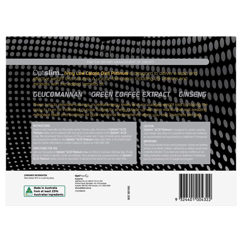 Optislim VLCD Platinum shake là công thức giảm cân VLCD RAPID độc đáo và mang tính cách mạng! Được thiết kế để giảm cơn đói, tăng quá trình đốt cháy chất béo, cung cấp mức năng lượng cao hơn và đẩy nhanh kết quả giảm cân. Chúng chứa tất cả các nhu cầu dinh dưỡng hàng ngày của bạn bao gồm 25 loại vitamin và khoáng chất khi bạn sử dụng 3 lần lắc mỗi ngày. Tất cả các sản phẩm Optislim VLCD đều có thể thay thế cho nhau để tăng thêm sự đa dạng.