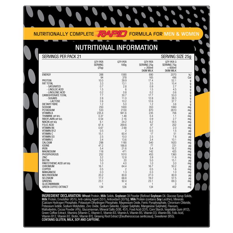 Protein lúa mì, Chất rắn sữa, Bột dầu đậu nành [Dầu đậu nành tinh luyện, Chất rắn xi-rô glucose, Protein sữa, Chất nhũ hóa (451i), Chất chống đóng cục (551), Chất chống oxy hóa (307b)], Protein sữa (chứa Lecithin đậu nành), Khoáng chất [Canxi hydro photphat, Kali dihydro photphat, Magiê oxit, Sắt pyrophosphat, Crom clorua, Kali iodua, Natri molybdat, Kẽm oxit, Natri selenit, Đồng sunfat, Mangan sunfat], Hương vị, Maltodextrin, Bột ca cao (4%), Glucomannan, Muối khoáng (508, 451), Axit thực phẩm (331), Tinh bột ngô, Kẹo cao su thực vật (412), Chiết xuất cà phê xanh, Vitamin [Vitamin C, Vitamin E, Vitamin B3, Vitamin A, Vitamin B5, Vitamin D3, Vitamin B6, Axit folic, Vitamin B12, Vitamin B2, Biotin, Vitamin B1], Chiết xuất rễ nhân sâm [Eleutherococcus senticosus], Chất tạo ngọt 955.