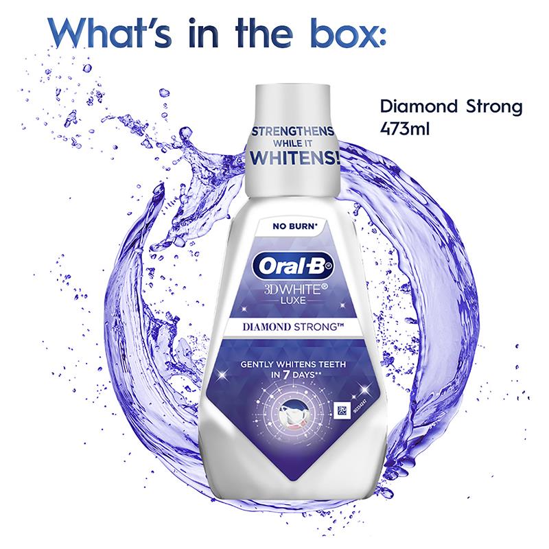 Nước súc miệng Oral-B 3DWhite Luxe Diamond Strong nhẹ nhàng làm trắng răng trong 7 ngày**. Giúp loại bỏ các vết bẩn hiện có trên bề mặt răng và bao phủ răng để ngăn ngừa các vết bẩn mới. Không chứa cồn, mang lại cảm giác không bỏng rát!# oral-b # bàn chải đánh răng điện # bàn chải đánh răng # kem đánh răng # chỉ nha khoa # nước súc miệng # đầu thay thế # miếng dán trắng răng # làm trắng # sạch # tươi mới # nhạy cảmTuyên bố về sản phẩm: Răng trắng hơn. Nụ cười rạng rỡ hơn.