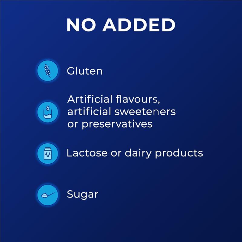 Không chứa: gluten, lactose, đường, màu nhân tạo, hương vị nhân tạo,