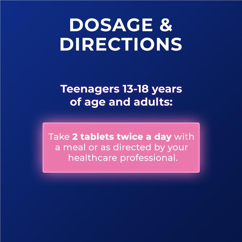 Phù hợp với: Người lớn và thanh thiếu niên từ 13 đến 18 tuổi: Uống 2 viên x 2 lần/ngày cùng bữa ăn. Hoặc theo chỉ dẫn của chuyên gia chăm sóc sức khỏe.
