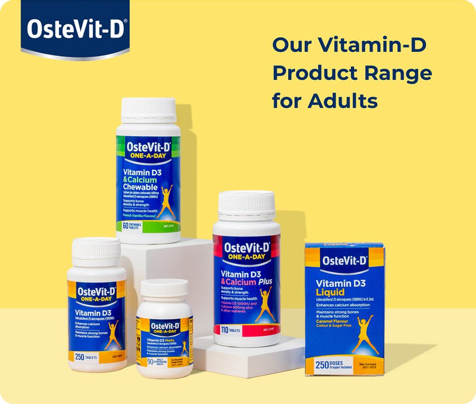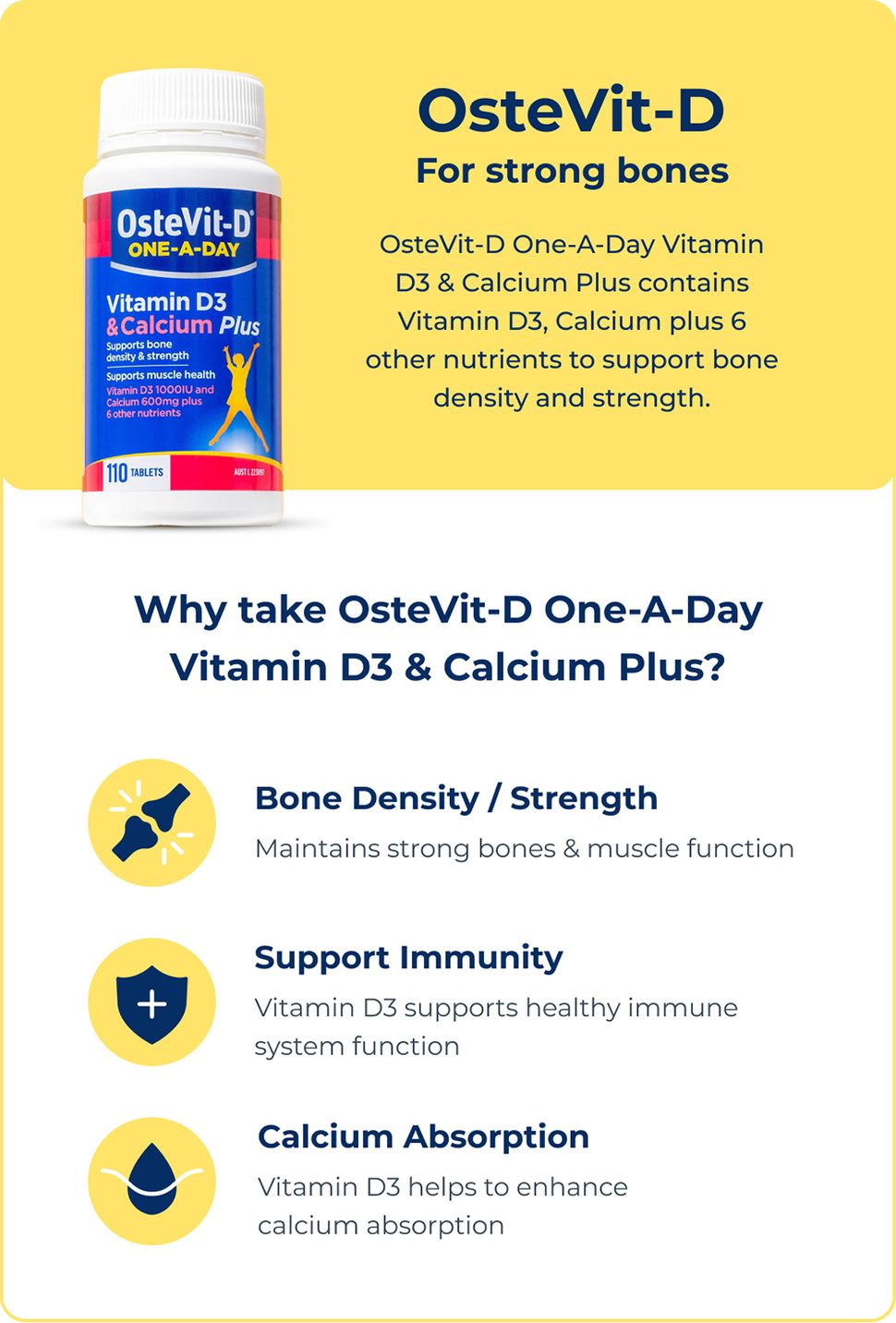 OsteVit-D One-A-Day Vitamin D3 & Calcium Plus hỗ trợ sức khỏe xương và chức năng cơ.Nó chứa 8 chất dinh dưỡng: