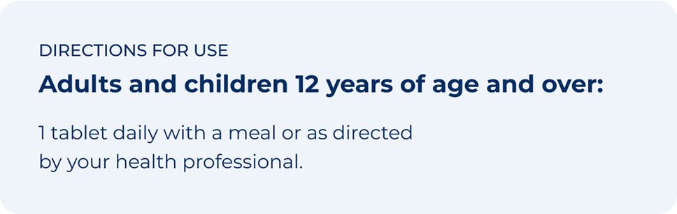 Người lớn và trẻ em trên 12 tuổi: Một viên mỗi ngày hoặc theo chỉ dẫn của chuyên gia chăm sóc sức khỏe của bạn. Trẻ em dưới 12 tuổi: Theo chỉ dẫn của chuyên gia chăm sóc sức khỏe của bạn