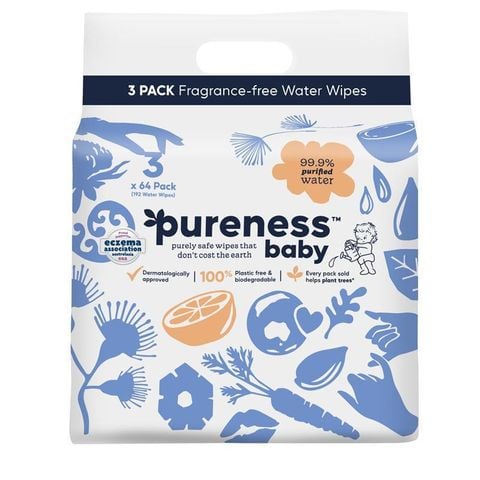 Khăn lau nước cho bé Pureness được làm bằng 99,9% nước tinh khiết và 100% vật liệu phân hủy sinh học, cân bằng giữa việc chăm sóc nhẹ nhàng và an toàn cho làn da nhạy cảm với việc chăm sóc nhẹ nhàng và an toàn cho hành tinh quý giá của chúng ta. Những chiếc khăn lau mềm mại, không mùi này phù hợp với cả làn da nhạy cảm nhất.
