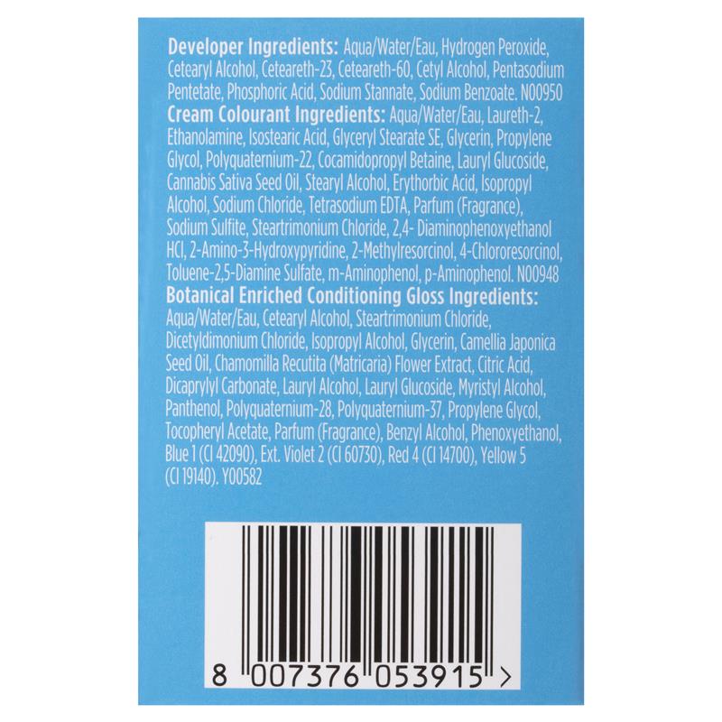 Nội dung đóng hộp: 1 Thuốc nhuộm không chứa amoniac 59,1 mL, 1 Thuốc hiện màu dạng kem 59,1 mL, 1 Thuốc dưỡng tóc sau khi nhuộm 11,8 mL, 1 Hướng dẫn sử dụng, 1 đôi Găng tay. Xem tờ hướng dẫn để biết hướng dẫn sử dụng. Chỉ sử dụng ngoài da.