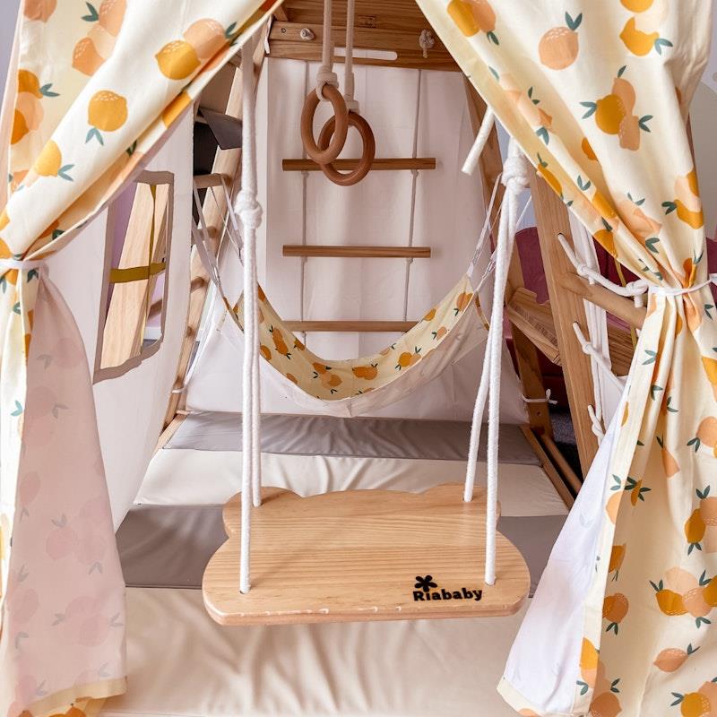 Chiếc võng trẻ em là một trong những phụ kiện không thể thiếu cho Nhà chơi Riababy của bạn. Được làm bằng vải canvas cotton 100% có thể giặt được và móc khóa kim loại có thể khóa cùng nhau, chịu được trọng lượng lên đến 20kg. Chiếc võng trẻ em này có tác dụng làm dịu giúp bé thư giãn và thoải mái, tạo thành một tổ ấm thoải mái để bé tận hưởng một khoảng thời gian yên tĩnh với những cuốn sách hoặc bản nhạc yêu thích của mình. Kích thước: Dài 85 x Rộng 44cm Chất liệu: Vải canvas cotton Tải trọng: 20kg Độ tuổi khuyến nghị: 6-48 tháng Các tùy chọn màu sắc: Gấu vui vẻ/Chanh may mắn/Mèo con yêu/Gấu phòng tập **Lưu ý: 1. Không bao gồm Nhà chơi 2. Không được đứng, nhảy khi sử dụng võng