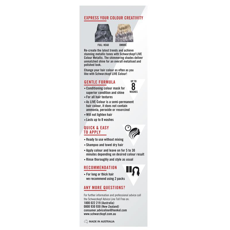 Thay đổi màu tóc thường xuyên theo ý muốn với Schwarzkopf LIVE Colour Metallic! Thể hiện sự sáng tạo về màu sắc và tái tạo xu hướng mới nhất với hiệu ứng ánh kim lấp lánh tuyệt đẹp lên đến 8 lần gội.