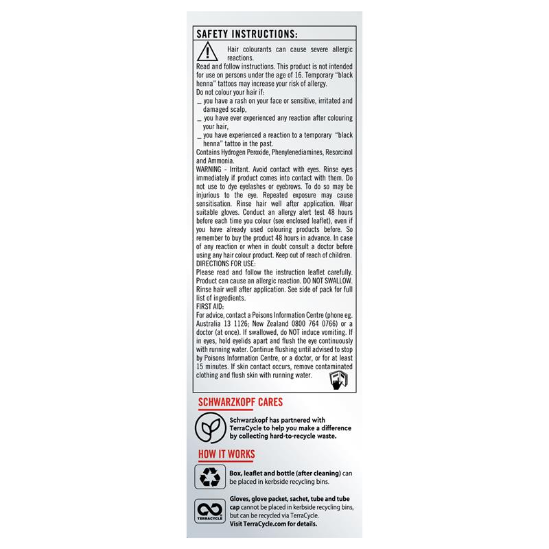 Thực hiện xét nghiệm cảnh báo dị ứng 48 giờ trước mỗi lần nhuộm (xem tờ hướng dẫn kèm theo), ngay cả khi bạn đã sử dụng sản phẩm nhuộm trước đó. Vì vậy, hãy nhớ mua sản phẩm trước 48 giờ. Trong trường hợp có bất kỳ phản ứng nào hoặc khi nghi ngờ, hãy tham khảo ý kiến bác sĩ trước khi sử dụng bất kỳ sản phẩm nhuộm tóc nào. Để xa tầm tay trẻ em."