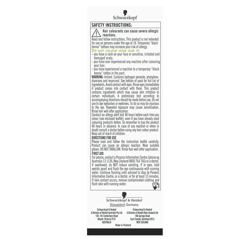 thử nghiệm sơ bộ theo hướng dẫn đi kèm trước khi sử dụng. Không sử dụng để nhuộm lông mi hoặc lông mày. Làm như vậy có thể gây hại cho mắt. Tiếp xúc nhiều lần có thể gây nhạy cảm. Xả sạch tóc sau khi thoa. Đeo găng tay phù hợp. Thực hiện thử nghiệm cảnh báo dị ứng 48 giờ trước mỗi lần nhuộm (xem tờ hướng dẫn kèm theo), ngay cả khi bạn đã sử dụng các sản phẩm nhuộm trước đó. Vì vậy, hãy nhớ mua sản phẩm trước 48 giờ. Trong trường hợp có bất kỳ phản ứng nào hoặc khi nghi ngờ, hãy tham khảo ý kiến bác sĩ trước khi sử dụng bất kỳ sản phẩm nhuộm tóc nào.