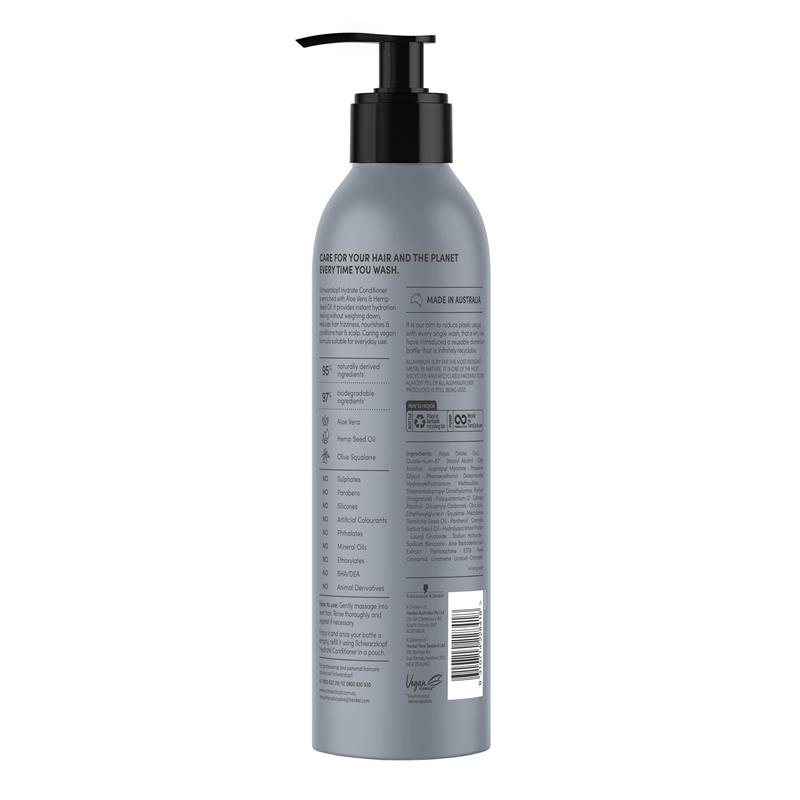Tuyên bố về sản phẩm: Không chứa: sulphates, parabens, silicones, chất tạo màu nhân tạo, phthalates, dầu khoáng, Ethoxylates, BHA/DEA, dẫn xuất từ động vật - Công thức thuần chay - 95% thành phần có nguồn gốc tự nhiên (bao gồm nước) - 97% thành phần phân hủy sinh học (bao gồm nước) - Được làm giàu với lô hội, dầu hạt cây gai dầu và squalane ô liu - Cung cấp cảm giác dưỡng ẩm tức thì mà không làm nặng tóc, giảm xơ rối, nuôi dưỡng & dưỡng tóc & da đầu - Công thức chăm sóc phù hợp để sử dụng hàng ngày - Sản xuất tại Úc Chai nhôm: - Chai có thể tái sử dụng và tái chế vô hạn - Chai: thùng tái chế bên lề đường; máy bơm: tái chế qua TerraCycle