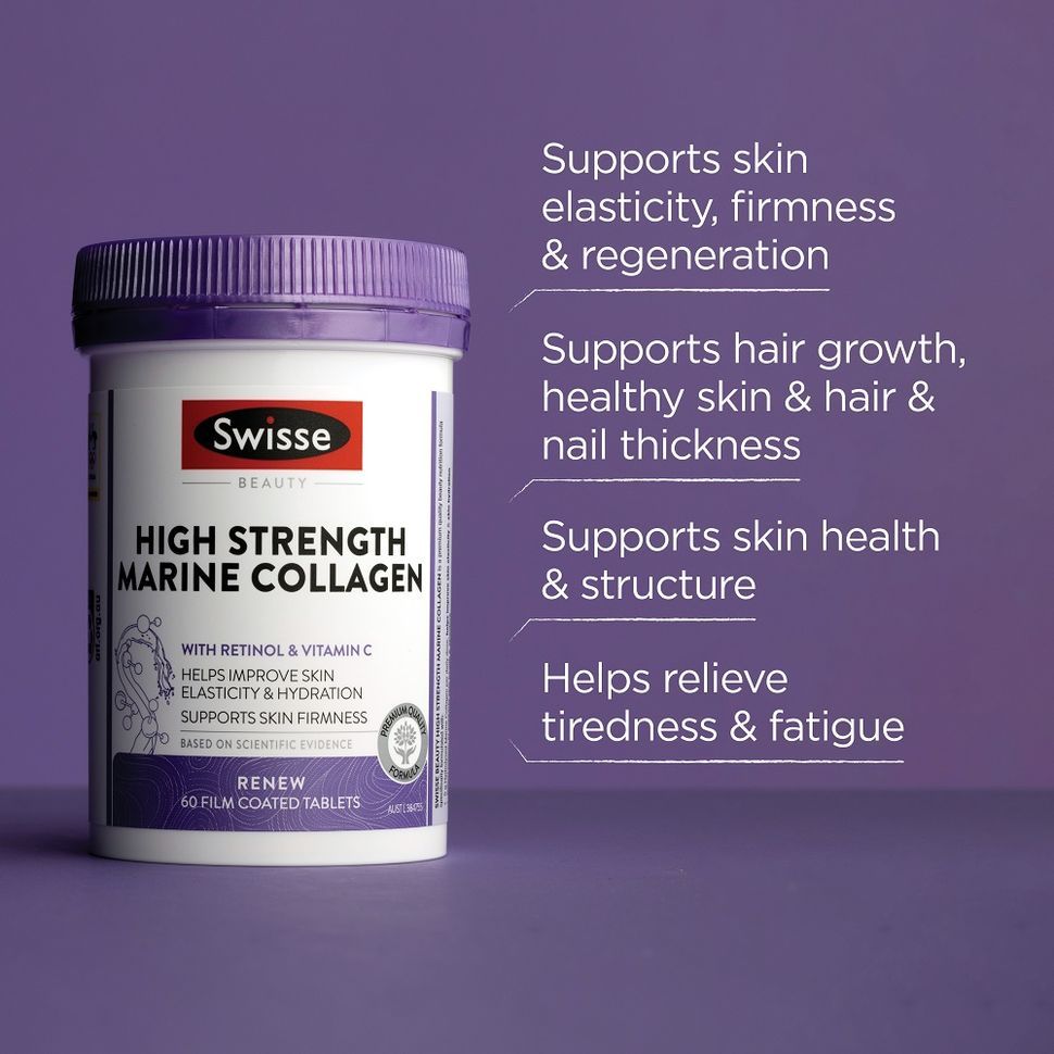 Mở khóa bí mật cho vẻ đẹp rạng rỡ với Swisse Beauty High Strength Marine Collagen. Kết hợp với 5g collagen biển giúp cải thiện độ đàn hồi và độ ẩm cho da, vitamin A cho sức khỏe và cấu trúc da, vitamin C hỗ trợ tái tạo da và độ săn chắc của da, và biotin hỗ trợ sức khỏe tóc và móng chắc khỏe. Mỗi liều dùng đều hỗ trợ làn da, tóc và móng của bạn. Hãy tự tin bước ra ngoài!