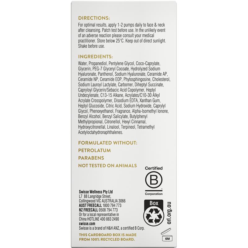 Khám phá làn da ẩm mượt, siêu ẩm với Serum tăng cường dưỡng ẩm Swisse Skincare Hyaluronic 2% Vitamin B5 Glow Booster. Sự kết hợp giữa axit hyaluronic, vitamin B5 và ceramides này giúp tăng cường rõ rệt mức độ ẩm của da, mang lại làn da mịn màng và tươi mới. Lý tưởng để duy trì làn da rạng rỡ, tươi tắn hàng ngày, huyết thanh này cung cấp độ ẩm rõ rệt đồng thời bảo vệ làn da của bạn khỏi các tác nhân gây căng thẳng hàng ngày từ môi trường. Làm mới quy trình chăm sóc da của bạn để có làn da trẻ hóa rõ rệt.Phù hợp với: Người ăn chay và ăn chay trường