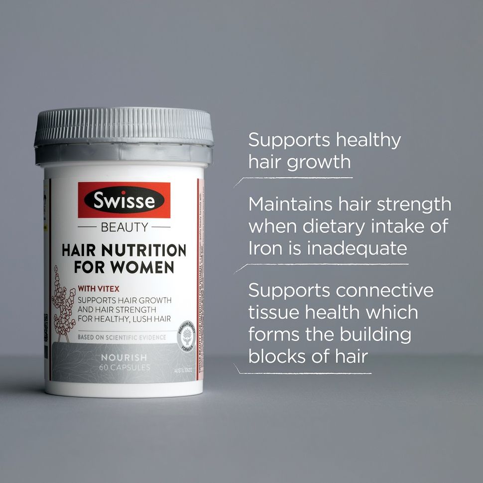 Phục hồi mái tóc của bạn với Swisse Beauty Hair Nutrition for Women. Chứa biotin, silica và hỗn hợp vitamin và khoáng chất, mỗi viên thuốc nuôi dưỡng bằng biotin để hỗ trợ sức khỏe và sự phát triển của tóc, và sắt để duy trì độ chắc khỏe của tóc khi chế độ ăn uống không đủ. Có sẵn ở liều lượng tiện lợi, hãy tận hưởng hành trình đến với mái tóc khỏe mạnh và óng mượt hơn ngay hôm nay.