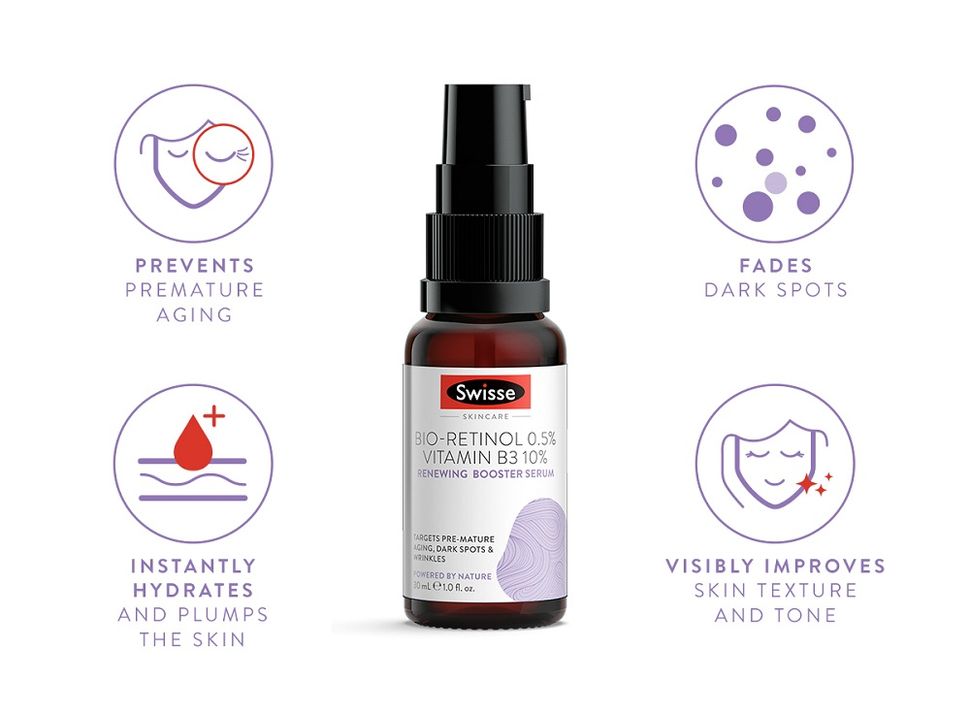 Hỗ trợ làn da rạng rỡ của bạn với Swisse Skincare Niacinamide 10% Skin Renewal Serum. Sản phẩm chứa niacinamide giúp làm giảm sự xuất hiện của các đốm đen và tăng cường độ mịn màng trong khi bakuchiol làm giảm sự xuất hiện của các nếp nhăn nhỏ để có làn da mịn màng hơn. Một sản phẩm không thể thiếu cho những người đam mê chăm sóc da thuần chay và ăn chay.