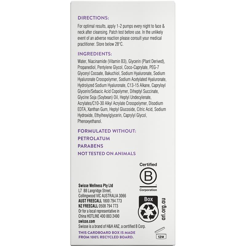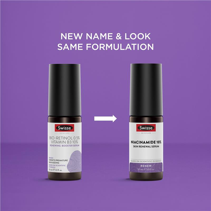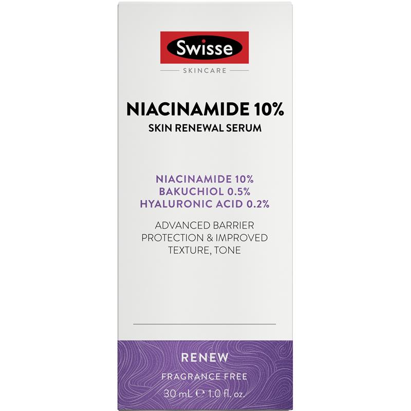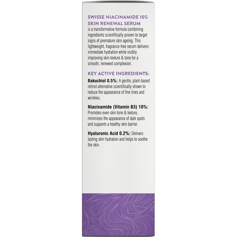 Giới thiệu Swisse Skincare Niacinamide 10% Skin Renewal Serum, sản phẩm hoàn hảo bổ sung vào chế độ chăm sóc da buổi tối của bạn. Loại huyết thanh này phù hợp với người ăn chay và ăn chay trường, tận dụng bakuchiol và niacinamide để cải thiện kết cấu và vẻ ngoài của da. Công thức của nó chứa niacinamide giúp giải quyết các vấn đề phổ biến về da như giảm thiểu sự xuất hiện của các đốm đen, nếp nhăn và nếp nhăn, thúc đẩy tông màu da đều hơn. Việc bổ sung axit hyaluronic giúp cung cấp độ ẩm, tăng cường độ sáng của da. Hãy chọn Swisse Skincare Niacinamide 10% Skin Renewal Serum để có trải nghiệm chăm sóc da kết hợp giữa cải tiến khoa học, đảm bảo làn da của bạn được nuôi dưỡng để trông và cảm thấy tốt nhất.Sản phẩm này đã thay đổi tên và bao bì nhưng vẫn giữ nguyên công thức tuyệt vời. Chúng tôi rất lưu tâm đến việc giảm thiểu chất thải và sử dụng tài nguyên của mình một cách có trách nhiệm, vì vậy chúng tôi không muốn loại bỏ sản phẩm hiện có chỉ vì nó ở trong bao bì "cũ". Bạn có thể nhận được các sản phẩm trông hơi khác trực tuyến khi chúng tôi bán hết sản phẩm hiện có trong bao bì hiện có.