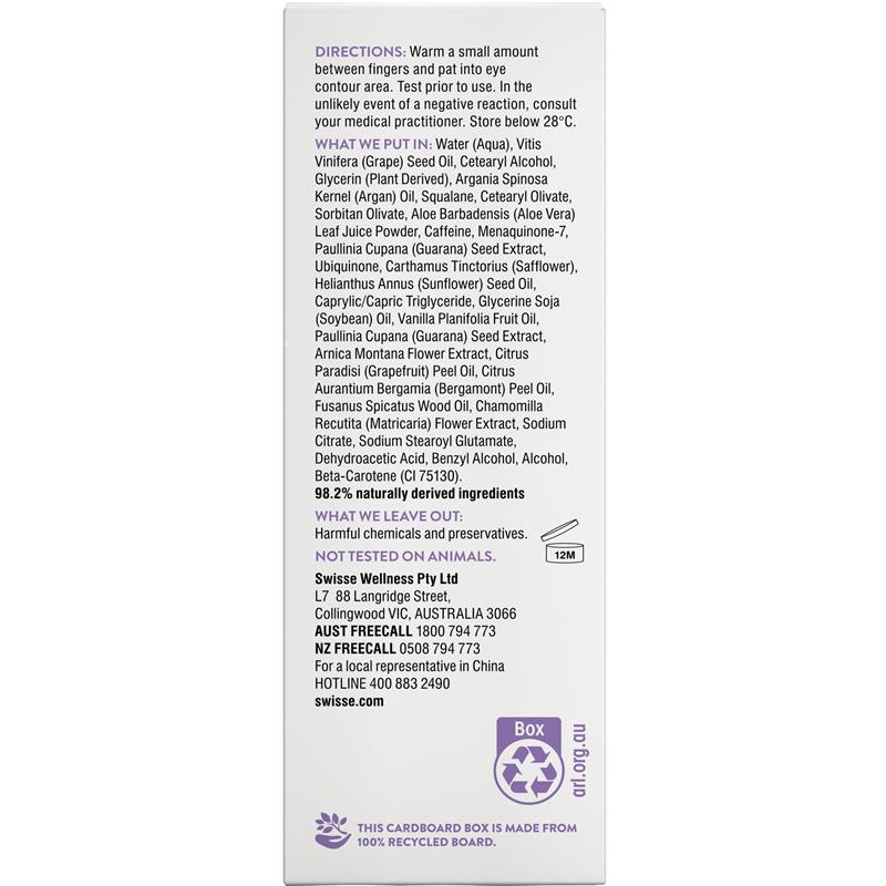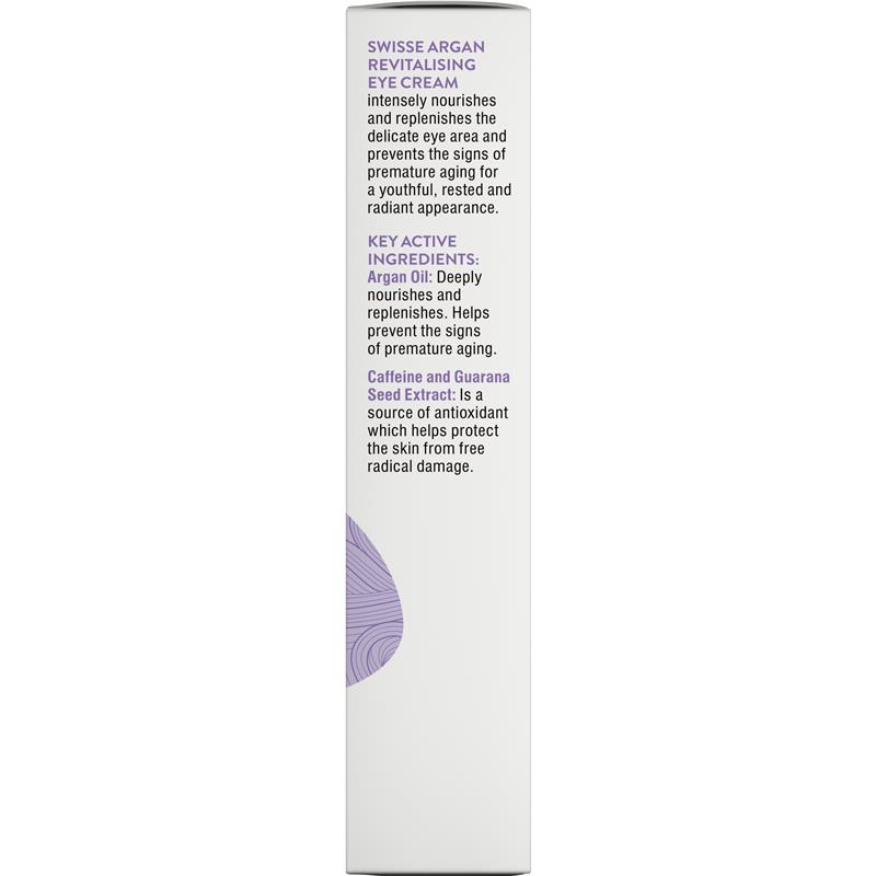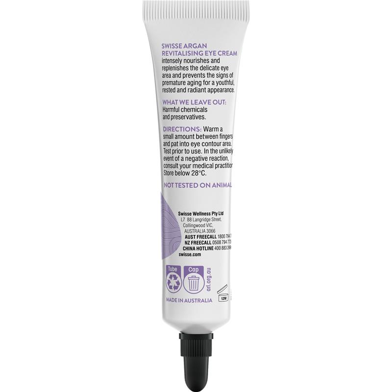 Làm tươi mới đôi mắt của bạn với Swisse Skincare Argan Revitalising Eye Cream. Được bào chế với dầu argan giúp ngăn ngừa các dấu hiệu lão hóa sớm và chất chống oxy hóa, giúp vùng da dưới mắt được tươi mới. Phù hợp với mọi loại da, kể cả người ăn chay, loại kem này là sản phẩm không thể thiếu để có vẻ ngoài tươi sáng, rạng rỡ.