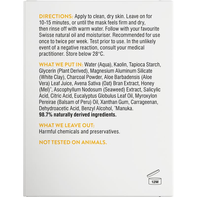 Trải nghiệm vẻ đẹp của Mặt nạ đất sét thải độc mật ong Manuka Swisse Skincare. Được thiết kế dành cho da thường, sản phẩm kết hợp than hoạt tính, đất sét kaolin và mật ong manuka để mang lại làn da rạng rỡ. Than hoạt tính và đất sét kanolin có tác dụng hiệu quả trong việc loại bỏ tế bào da chết và thu nhỏ lỗ chân lông. Các thành phần đảm bảo một lựa chọn nhẹ nhàng nhưng hiệu quả, hoàn hảo để kết hợp vào quy trình chăm sóc da thường xuyên của bạn. Mặt nạ này chứa mật ong Manuka để thúc đẩy làn da rạng rỡ tự nhiên, giúp làn da của bạn mềm mại và trông sáng mịn.Phù hợp với: Người ăn chay