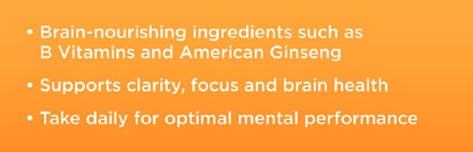 CEREBOOST® (nhân sâm Mỹ) (chiết xuất Panax quinquefolius 100 mg) từ rễ khô (Chuẩn hóa để chứa ginsenosides Rg1 - Re - Rb1 - Rb2 - Rc - Rd 10 mg) 200 mg; Biotin 3,8 microgam; Choline (từ choline bitartrate) 120 mg; Axit folic 200 microgam; Nicotinamide 8 mg; Vitamin B1 (thiamine từ thiamine từ hydrochloride) 600 microgam; Vitamin B2 (riboflavin) 650 microgam; Vitamin B5 (axit pantothenic từ canxi pantothenate) 3 mg; Vitamin B6 (pyridoxine từ pyridoxine hydrochloride) 850 microgam; Vitamin B12 (Cyanocobalamin) 1,2 microgam; Tyrosine 18,75 microgam; Phosphatidylserine (bột lecithin đậu nành giàu phosphatidylserine) 12,5 mg.