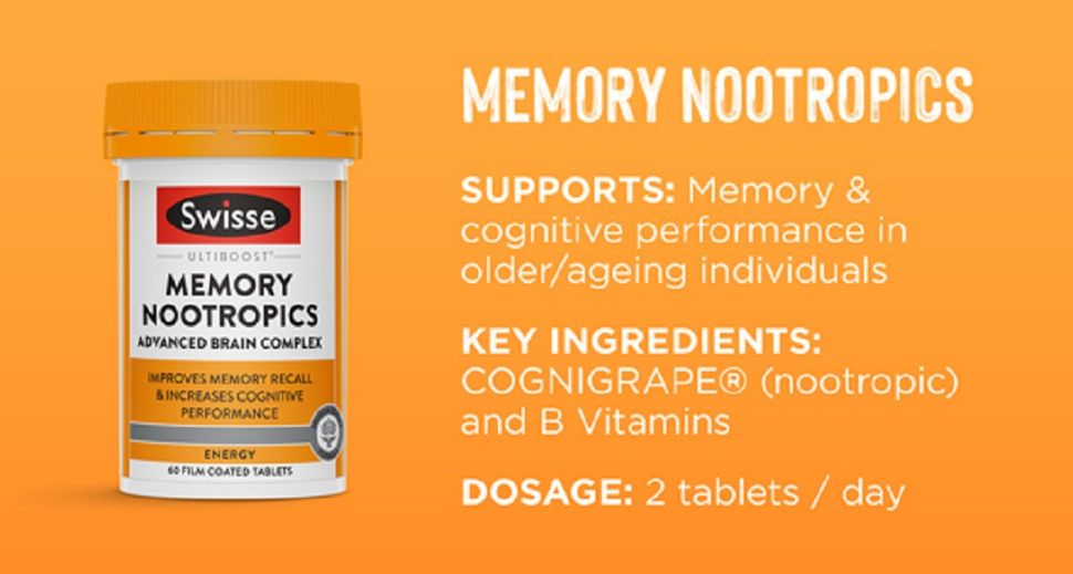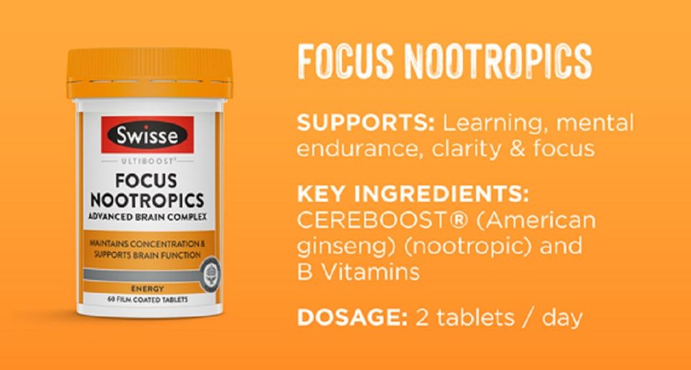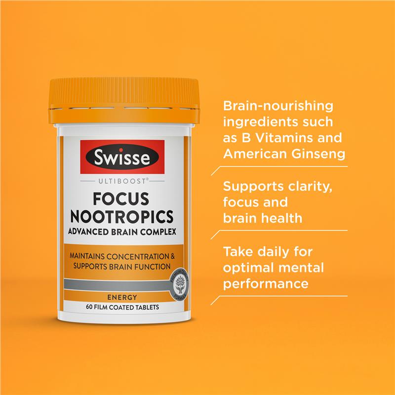 Khám phá đồng minh của bạn trong việc hỗ trợ sự minh mẫn tinh thần, Swisse Ulitboost Focus Nootropics. Công thức này được bổ sung CEREBOOST® và hỗn hợp vitamin B giúp duy trì sức khỏe não bộ. Tận hưởng sự hỗ trợ hàng ngày để duy trì sự tập trung và minh mẫn đồng thời hỗ trợ sức khỏe não bộ và chức năng nhận thức.