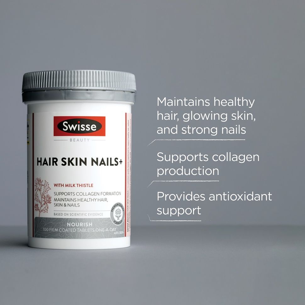 Hãy đón nhận vẻ đẹp của sức khỏe với Swisse Beauty Hair Skin Nails+. Công thức chất lượng cao này được bổ sung vitamin C, biotin, silicon và kẽm. Vitamin C hỗ trợ sức khỏe làn da và hình thành collagen, trong khi biotin hỗ trợ sức khỏe móng và tóc. Trải nghiệm niềm vui của một loại thực phẩm bổ sung hỗ trợ vẻ đẹp của bạn từ trong ra ngoài, mang đến cho bạn sự tự tin tỏa sáng.