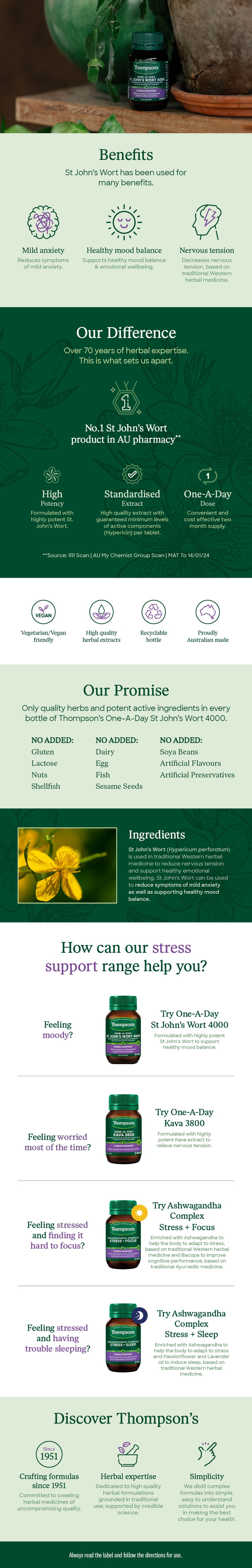 Thompson's One-A-Day St John's Wort 4000 được bào chế với chiết xuất thảo dược có hiệu lực cao để cung cấp liều dùng tiện lợi một lần một ngày để:- Giúp giảm các triệu chứng lo âu nhẹ