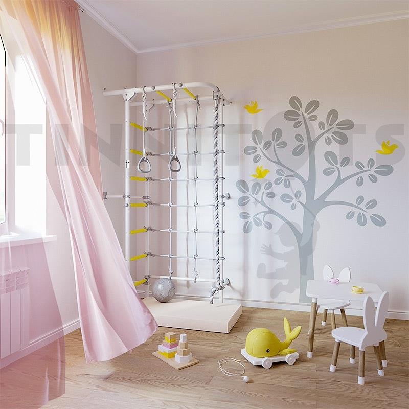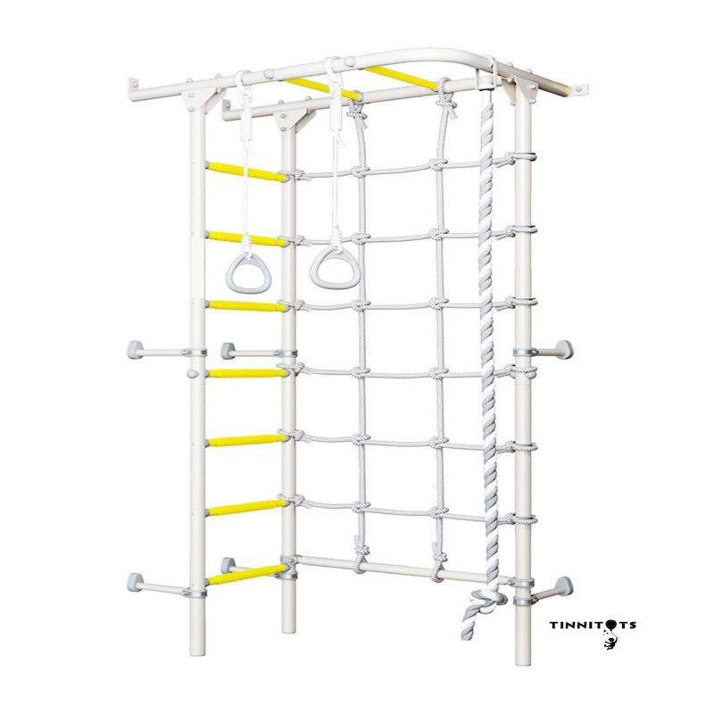 Swedish Corner Wallbars - S4 là khung leo trèo cho tường góc, được thiết kế dành riêng cho nhà ở hoặc trung tâm nơi không gian hạn chế. Bộ đồ chơi này đi kèm với xà đơn, thang massage để leo trèo, dây leo, vòng tập thể dục và lưới nhện. Cấu trúc tổng thể có thể chịu được trọng lượng lên đến 100 kg (tải thử - 200 kg).