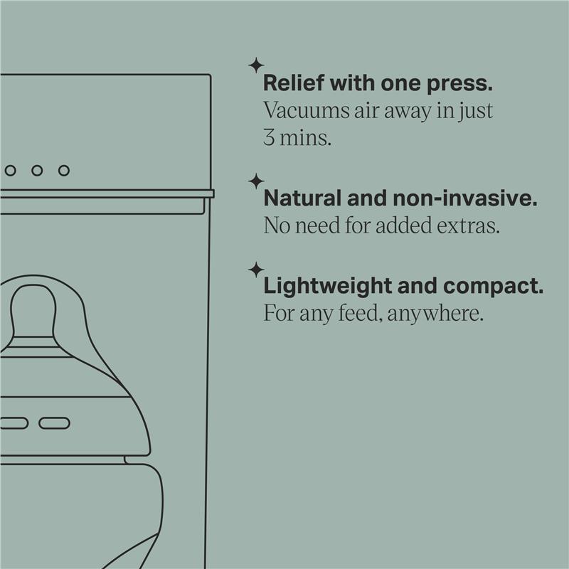 Cải tiến chống đầy hơi mang tính đột phá. Công nghệ chân không này loại bỏ không khí hòa tan khỏi sữa của bé. Giảm đầy hơi, giảm căng thẳng và ngủ ngon hơn. • Giảm đau bụng chỉ bằng một lần ấn • Hút không khí hòa tan chỉ trong 3 phút • Tự nhiên và không xâm lấn • Nhẹ và nhỏ gọn. Cho mọi lần cho bé bú, ở mọi nơi • Chúng tôi khuyên bạn nên sử dụng với bình chống đầy hơi tiên tiến của chúng tôi *Từ một nghiên cứu độc lập với 51 phụ huynh tại Hoa Kỳ và Vương quốc Anh, tháng 6/tháng 7 năm 2022. Để biết thêm thông tin, vui lòng truy cập tommeetippee.com/verify. **Colicsoothe phù hợp với bất kỳ bình sữa 150ml/5oz hoặc nhỏ hơn, nhưng có thể không phù hợp với bình sữa lớn hơn.
