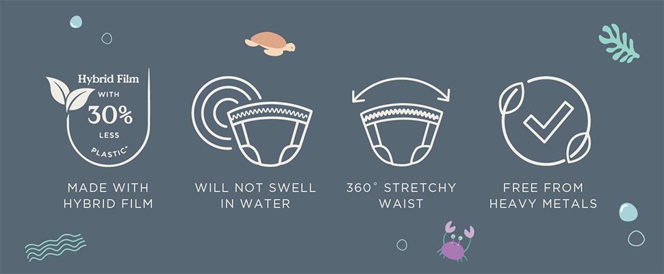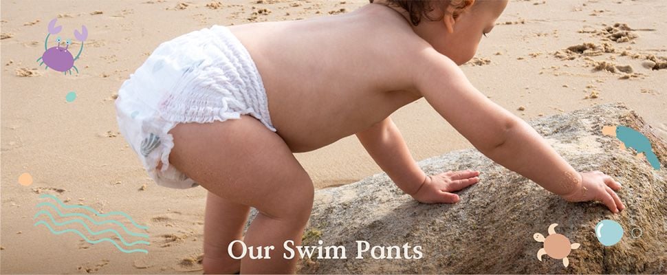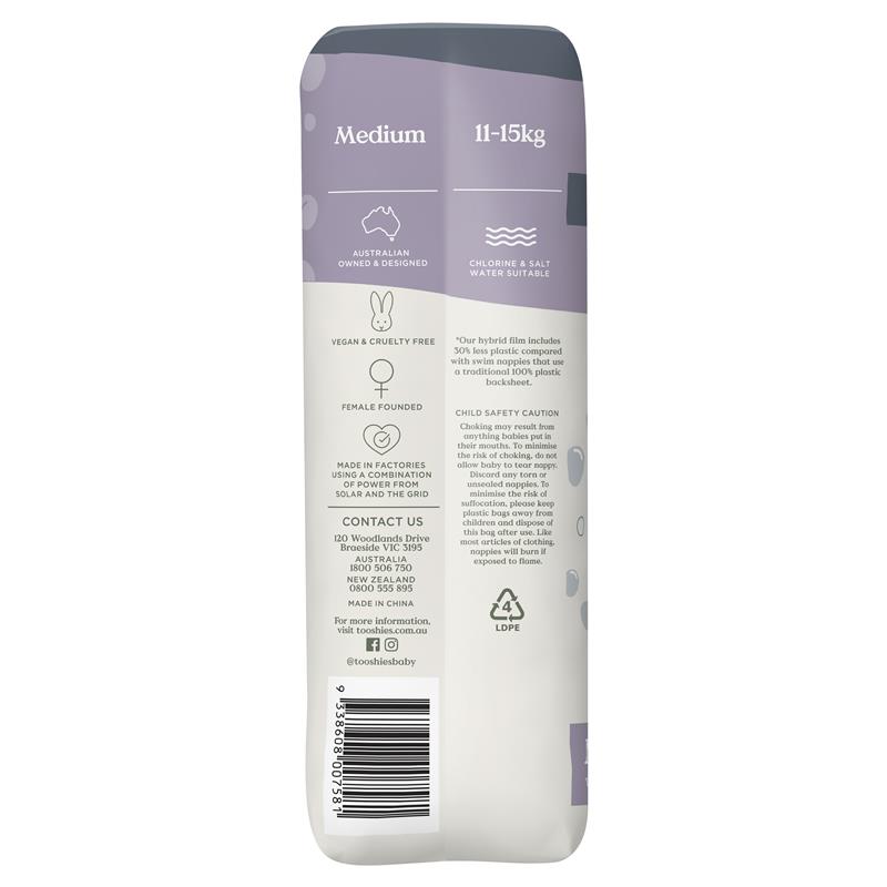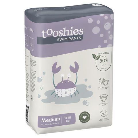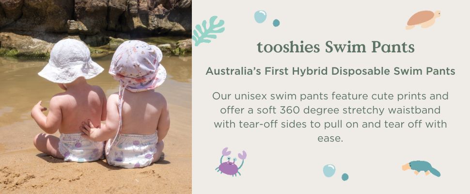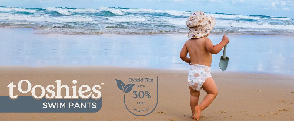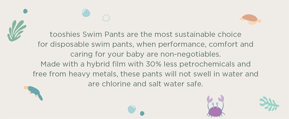 Quần bơi tooshies là tã bơi dùng một lần thân thiện hơn với môi trường - được làm bằng màng lai chứa ít hơn 30% nhựa, không có kim loại nặng và không bị phồng hoặc tràn ra ngoài nước.