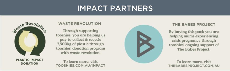 Được thiết kế tại Melbourne bởi một nhóm phụ huynh, tooshies hỗ trợ Waste Revolution để giúp giảm thiểu rác thải nhựa trong môi trường Úc và Dự án Babes, giúp tạo ra không gian an toàn cho phụ nữ Úc đang trải qua thời kỳ khủng hoảng thai kỳ.