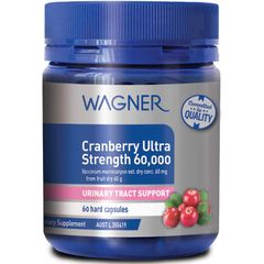 Nam việt quất hỗ trợ sức khỏe đường tiết niệu và cung cấp hỗ trợ chống oxy hóa. Wagner Cranberry Ultra Strength 60.000 được cung cấp với liều dùng một lần một ngày.