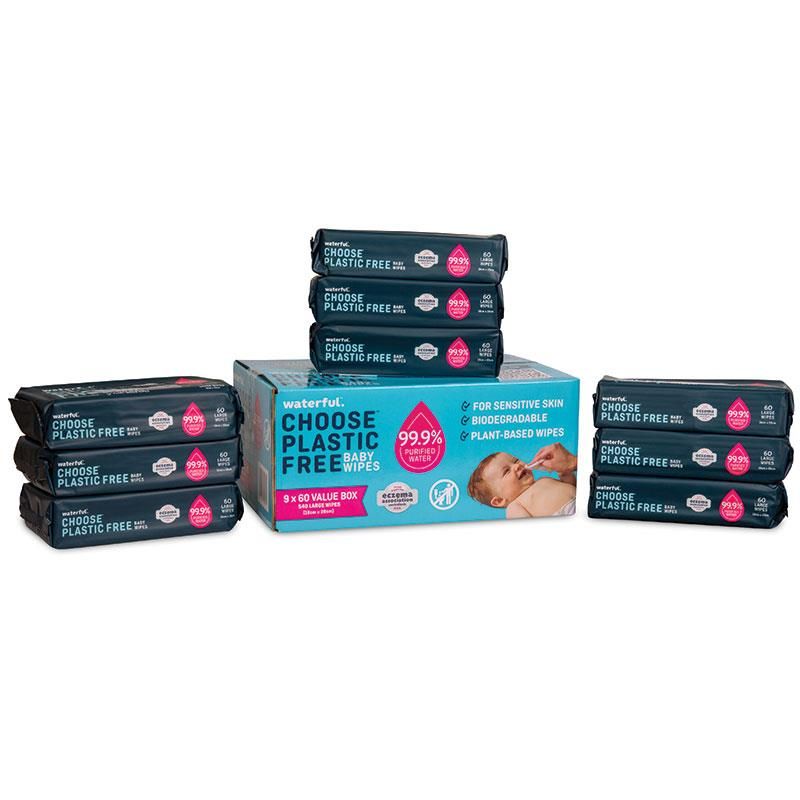 Khăn lau Waterful chứa 99,9% nước tinh khiết. Đã được kiểm nghiệm da liễu và được Allergy UK chấp thuận, không có loại khăn lau nào tốt hơn cho làn da nhạy cảm của bé. Không giống như hầu hết các loại khăn lau khác, khăn lau Waterful hoàn toàn không chứa nhựa. Khăn lau em bé tốt nhất cho hành tinh của chúng ta. Giúp cứu đại dương và hành tinh của chúng ta cho thế hệ tiếp theo. Giảm thiểu nhựa. Hãy chọn Waterful.
