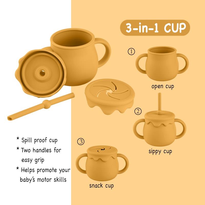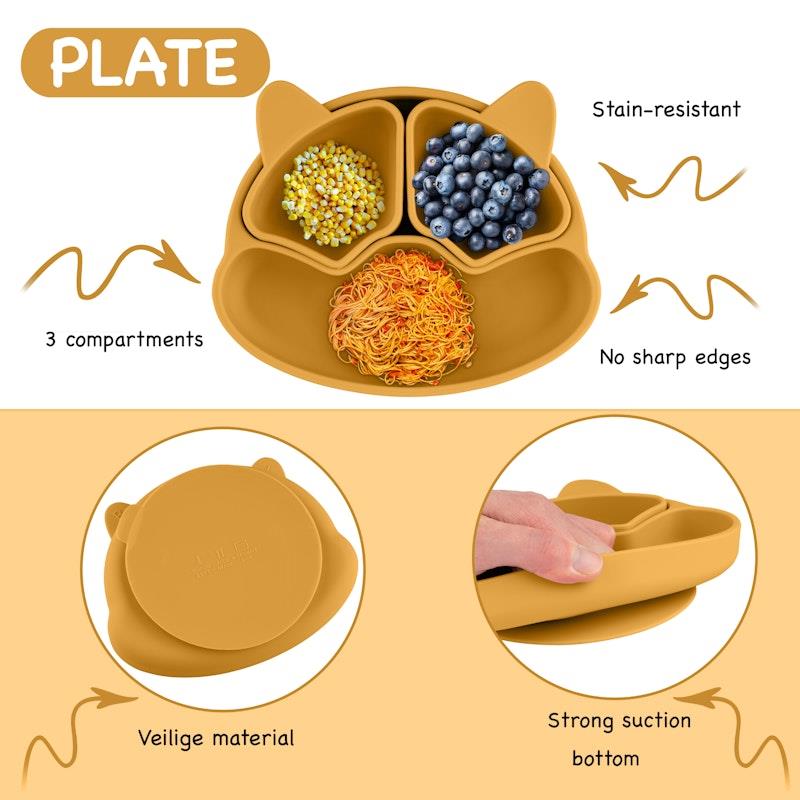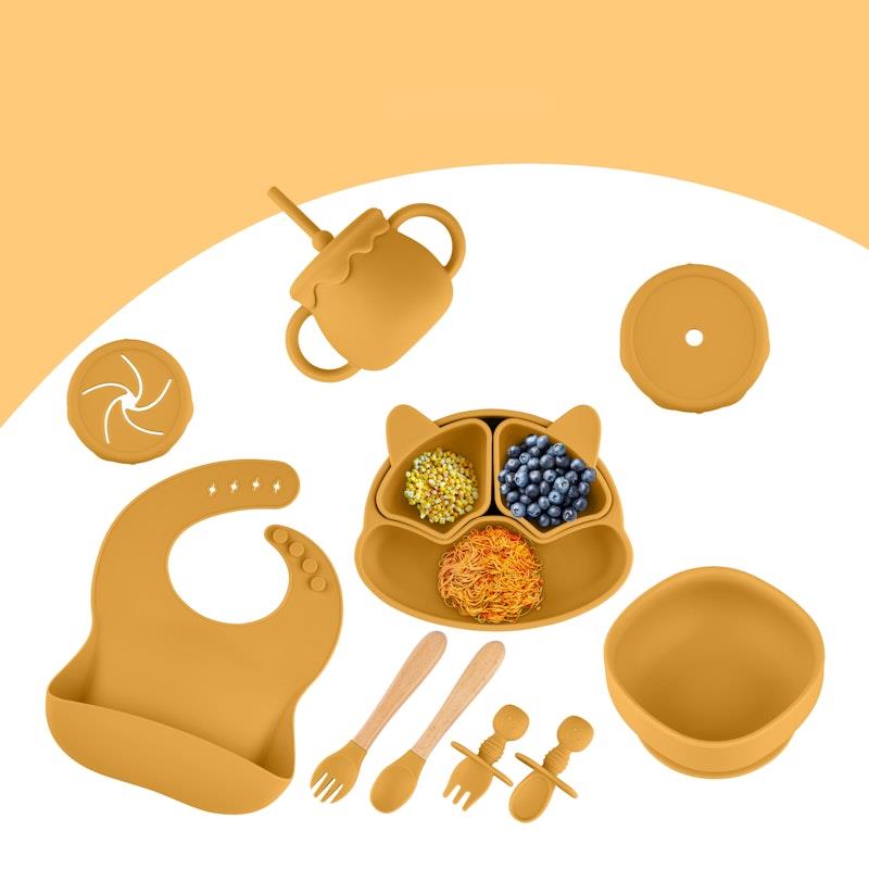 Chất liệu silicon cấp thực phẩm, chịu nhiệt và lạnh, Bộ 11 món toàn diện, Bền và lâu dài, Không độc hại và thân thiện với môi trường, Dễ vệ sinh và chống ố, Đế hút mạnh, Dụng cụ tiện dụng cho bàn tay nhỏ, Yếm có thể điều chỉnh với túi đựng